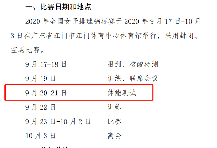 2020年全国女子排球锦标赛于2020年9月17日-10月3日在广东省江门市体育中心体育馆举行,采用封闭、空场比赛。和目前所有开始的比赛一样,运动员到达后要进行报到、核酸检测和训练,然后比赛,比赛时间为9月23日-10月2日,但在所有的流程中,有一点值得注意,9月20-21日体能测试。不要小看这一部分,体能测试今年将影响最终的排名。