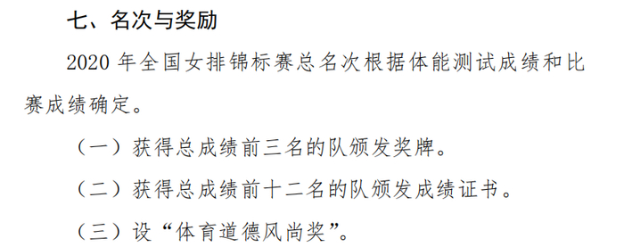 在竞赛规程的第七条“名次与奖励”中,明确写着2020年全国女排锦标赛总名次根据体能测试成绩和比赛成绩确定。也就是说不仅要比赛成绩好,体能测试成绩也要好。