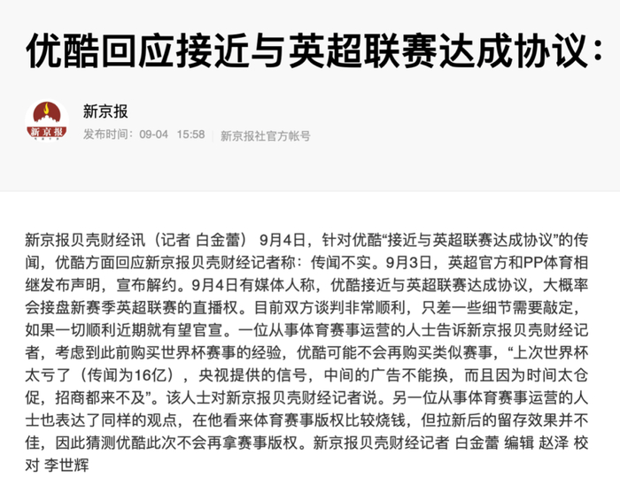《新京报》撰文报道优酷回应购入英超传闻