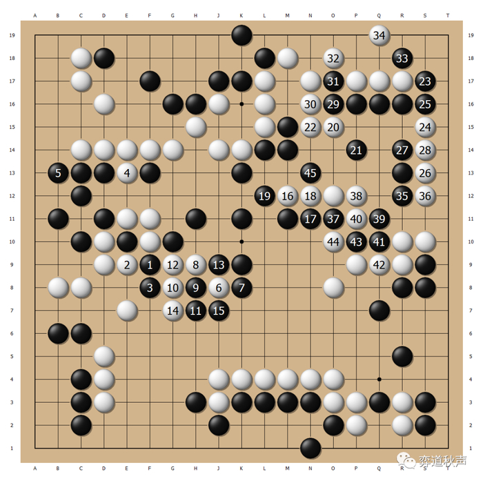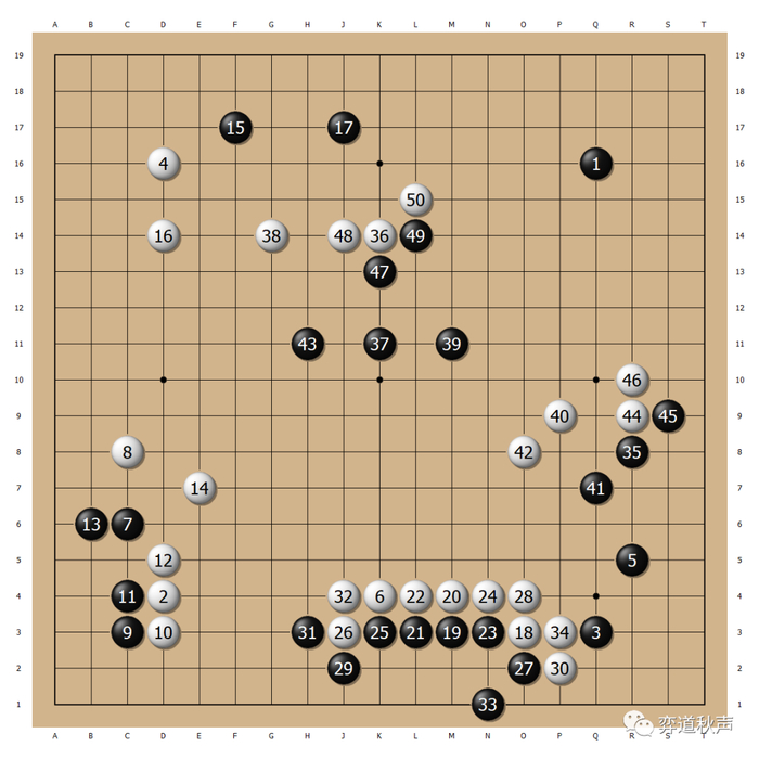 行棋至黑29,与一年前的首届富士通杯半决赛武宫正树执白对阵小林光一的局面一模一样。那盘棋是武宫8目半大胜,两大巨擘在生死战中以此开局,显示出各自的风格与个性。
