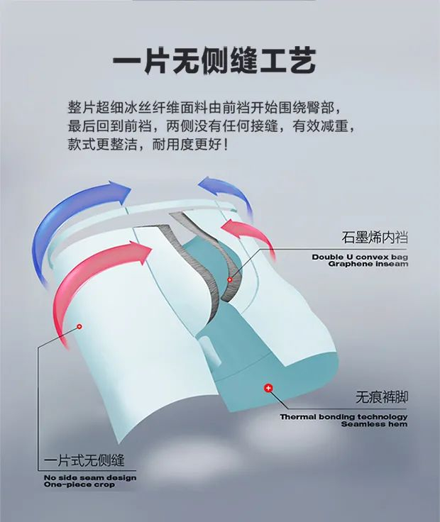 整片超细冰丝纤维面料由前裆开始围绕臀部,最后回到前裆,两侧没有任何接缝,有效减重,款式更整洁,耐用度更好!