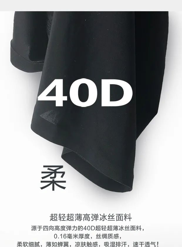 源于四向高度弹力的40D超轻超薄冰丝面料,0.16毫米厚度,丝绸质感,柔软细腻,薄如蝉翼,凉肤触感,吸湿排汗,速干透气!