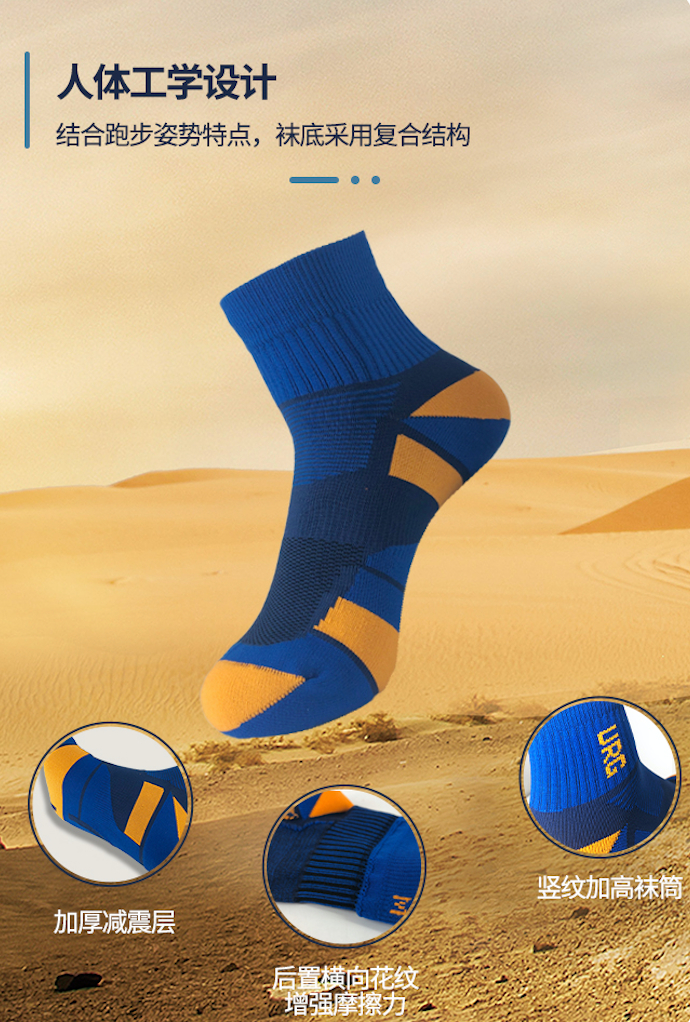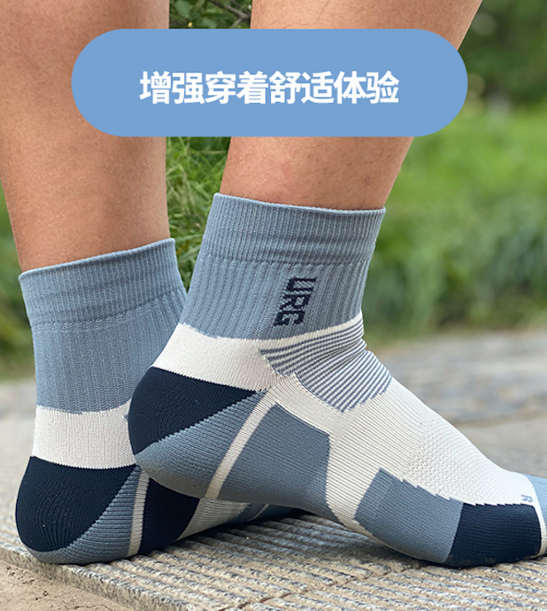 还有,我们根据脚掌的构造,参考人体工学设计理念,结合中国跑者的跑步姿势特点,决定在袜底采用复合结构:加厚的减震层、360度环形压力环、摩擦防滑带,相互搭配,功能出众。