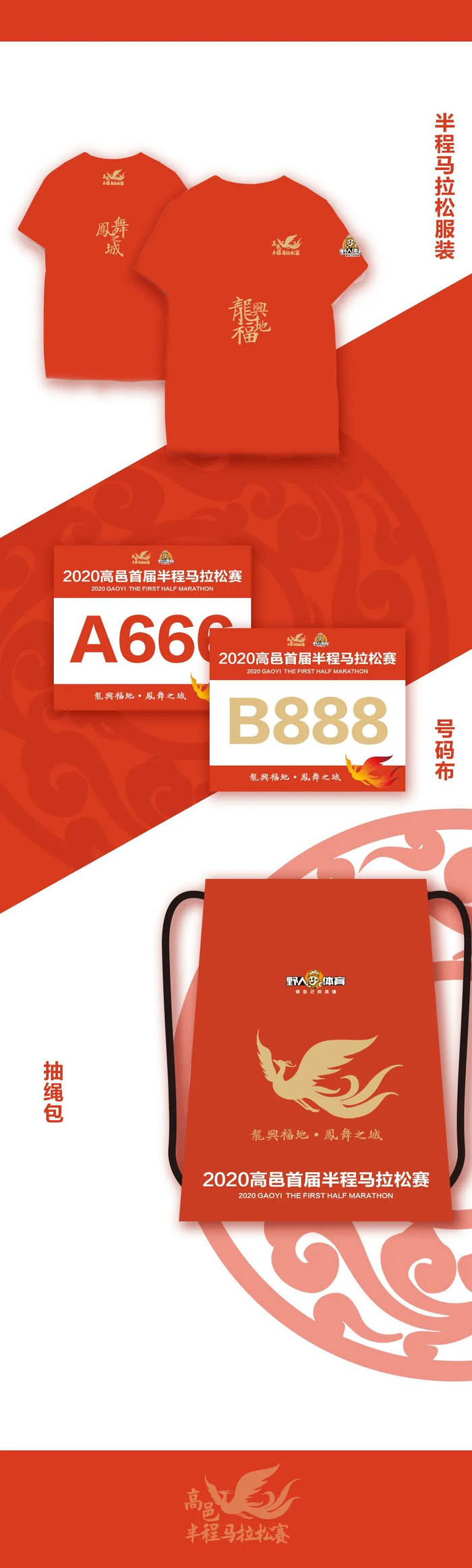 本次半程马拉松作为久违的线下赛,在龙兴福地高邑举办,参赛T恤、号码布、抽绳包等都取自吉祥、平安的寓意,又因在国庆节后开跑,为延续国庆节的欢腾,色调上采取代表喜庆的中国红,并有凤凰展翅飞的护佑之意。