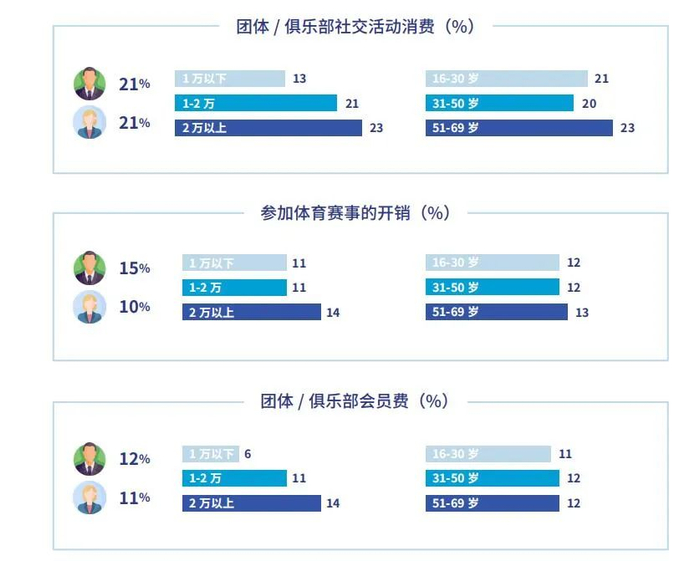 大众健身消费调研发现,过往一年在体育及相关方面进行消费的比例达到96%,人均超过4000元。其中,一线城市、高收入家庭的年轻群体是其中的主力消费人群,消费比例高、金额大、消费项目覆盖面广。