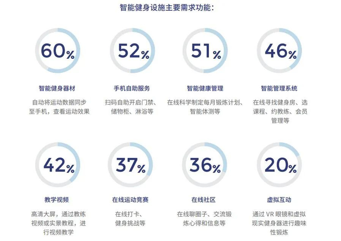 对于健身器材具有的智能健身功能的态度,当前需求尚不强烈,同时在具体使用场景方面,也主要集中在终端数据和相关功能打通,例如移动端同步数据的需求为60%、手机自助服务的需求为52%、智能健康管理的需求为51%等。