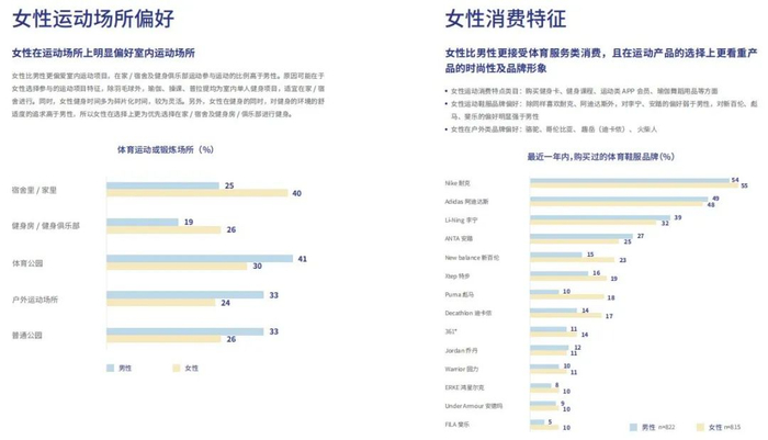 而在运动鞋服品牌偏好上,同样存在一定的性别差异,女性对于李宁、安踏等本土品牌的热衷度低与男性,相对更加青睐新百伦、彪马、斐乐等偏运动时尚的品牌;而在户外品牌方面则有更高的品牌集中度,更加聚焦在骆驼、哥伦比亚、迪卡侬等。