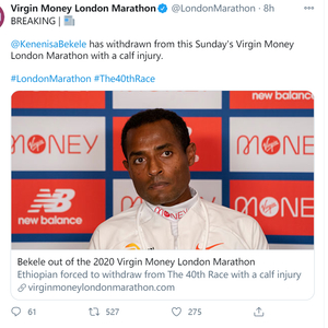 遗憾!贝克勒因小腿受伤,退出2020伦敦马拉松