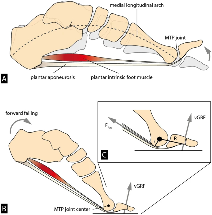 从病因上讲,足底筋膜炎被认为是由于脚的纵向足弓过度而反复地负荷所引起的伤害。最近的证据表明,足底筋膜炎可能与足部肌肉无力而无法提供足部稳定性有关,从而增加了足底筋膜的张力,该张力缠绕在MTP关节周围,大概影响了其稳定性。