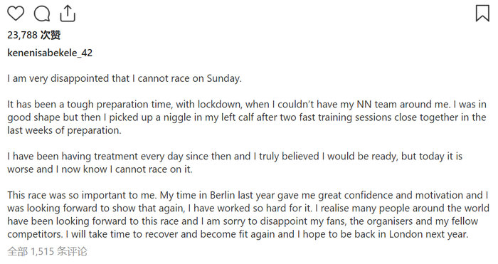 这场比赛对我来说太重要了。去年在柏林的时光给了我很大的信心和动力,我期待着再次证明这一点,我为此付出了那么多的努力。我意识到世界上很多人都在期待这场比赛,我很抱歉让我的粉丝、组织者和其他竞争者失望了。我需要时间恢复和恢复健康,我希望明年能回到伦敦。”