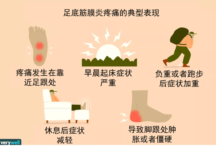 ● 最典型症状:早晨醒后下床,脚落地时,足跟部疼痛最为明显,走动一会儿后疼痛会有所缓解;