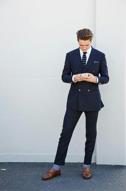 比如下面这身装扮,简约而不简单---一身讲究的深蓝西装,衣服收腰的设计让上半身多了风衣一般的修饰感。并且袜子条纹跟领结上的条纹相互呼应,细节彰显时尚搭配的魅力。