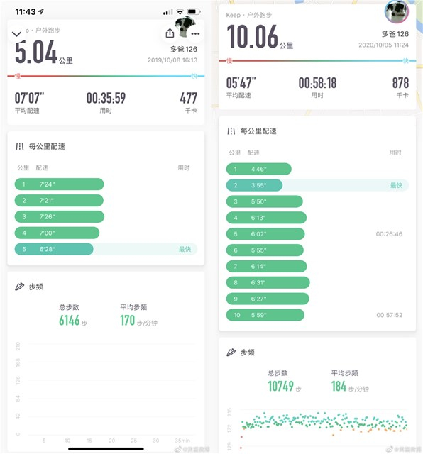 从跑步数据上来看,一年以来跑步的坚持,黄磊进步显著:一年前跑步5公里,配速7分07秒,步频170;现在10公里平均配速5分47秒,步频184。不管是速度、距离,还是跑步技术都有了很大提升。