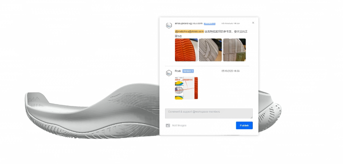 但引入数字化3D技术后,设计师只需要将平面图纸和鞋子材质扫描到系统中,便可以自动生成逼真的3D效果图,工作量显著减少。不仅如此,该系统还支持线上细节评审和即时修改。今年疫情期间,这套方案就派上了大用场,安踏在国内和美国的设计团队可以实现线上沟通和调整产品设计,完美协同。