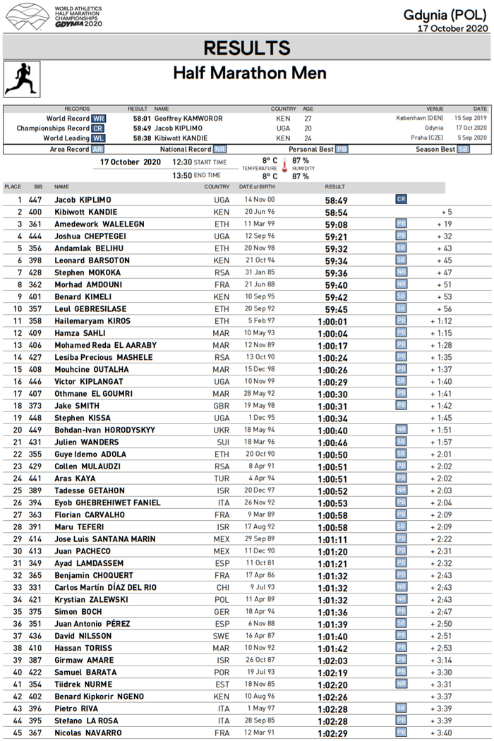 男子组——夺标大热门、乌干达名将切普特盖最终收获第四名,成绩还不错——59:21,这可是他半马首秀的战绩呀!