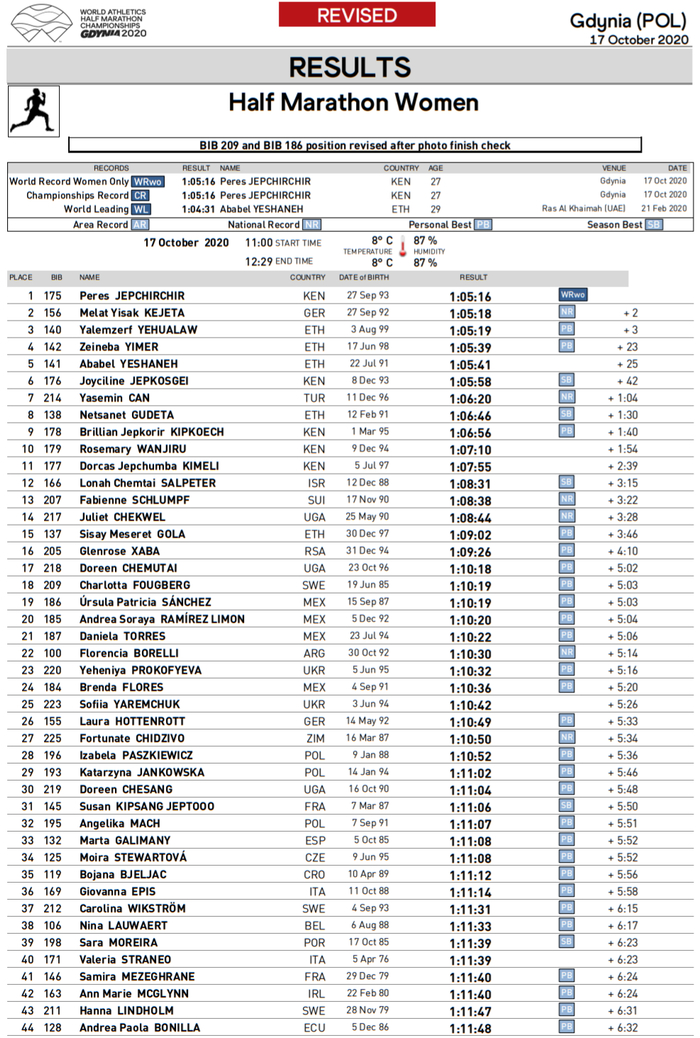 亚军是德国的Melat Yisak Kejeta,成绩是1:05:18,新的国家纪录。季军是埃塞俄比亚的Yalemzerf Yehualaw,成绩是1:05:19,创PB。