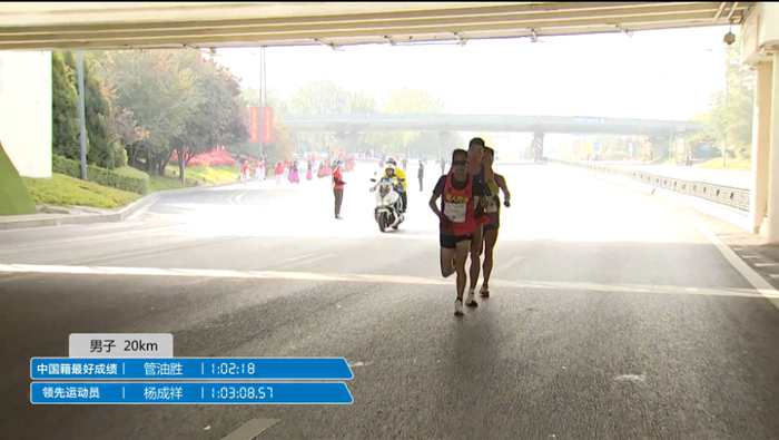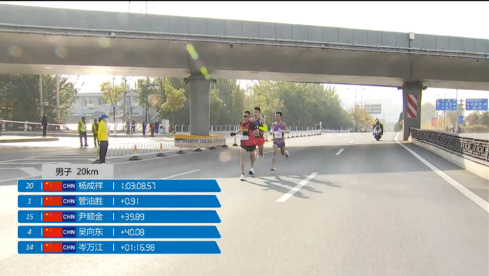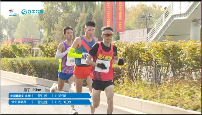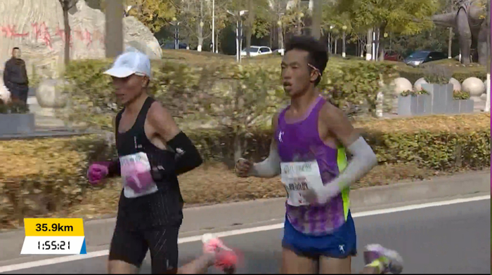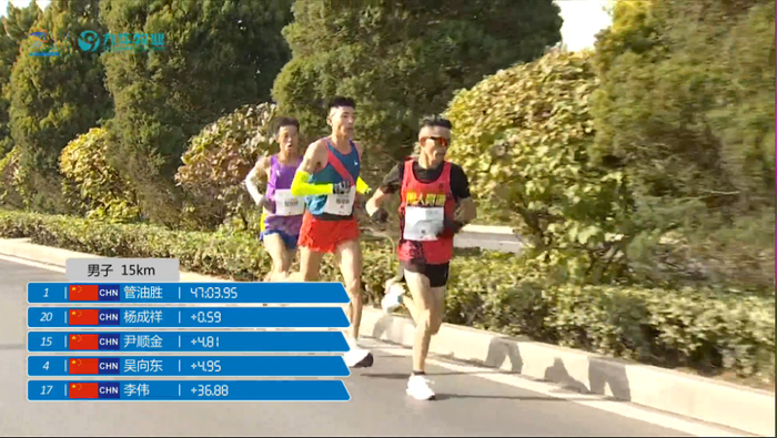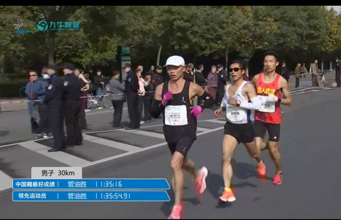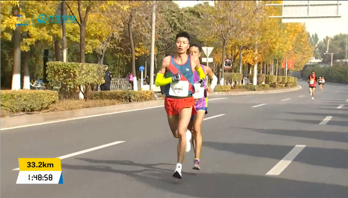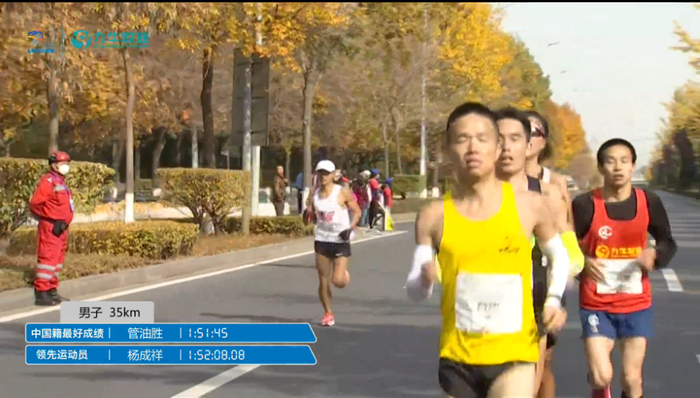 35公里用时1:52:08左右,均速3分12秒,此时杨成祥开始加速甩开了管油胜,现在还能加速,真是厉害了;管油胜逐渐落后与岑万江并驾齐驱: