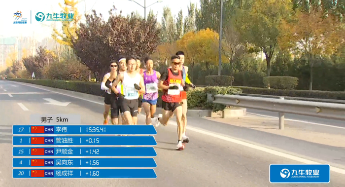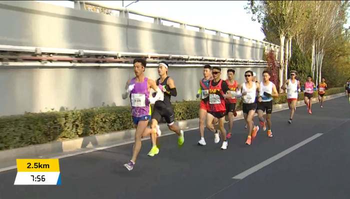 2.5公里用时7分55秒,配速3分3秒,此时管油胜跑至队首领跑,李伟、杨定宏紧随其后,第一集团剩余8人: