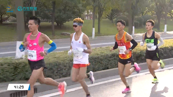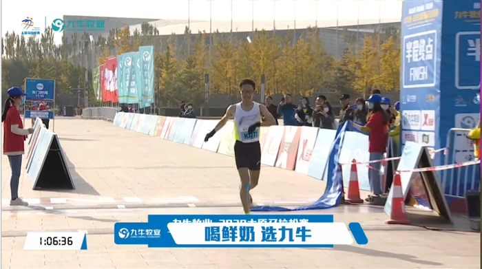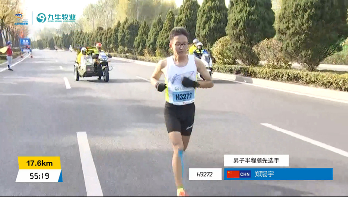 半马方面,郑冠宇夺得男子半马冠军,成绩为1:06:35左右,均速3分09秒: