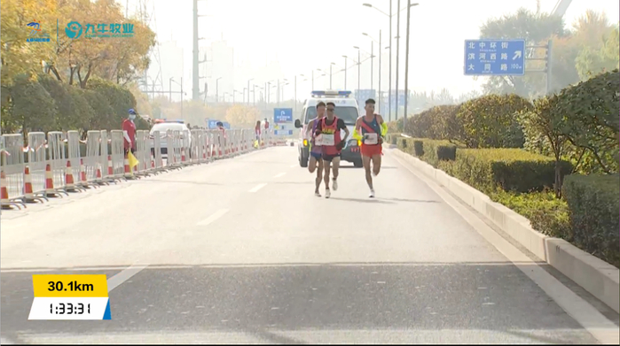 30公里用时1:35:54,均速3分11秒,三人状态还不错,就看最后12公里个人发挥了,真正的马拉松较量开始了: