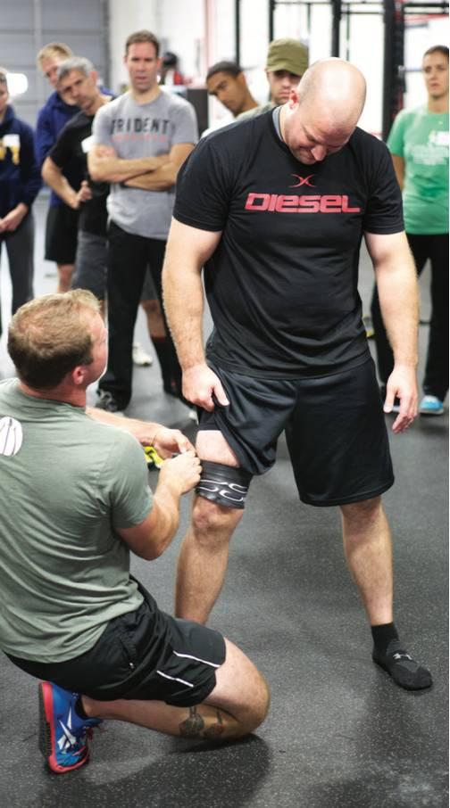 方法:使用缠绕带,从膝盖下方开始向上(近心端)缠绕。如前文所述,每一匝露出1.3厘米的宽度,使用75% 的张力。在快缠完的时候,在患处上方打结。然后,交替进行数分钟的脚背屈伸。
