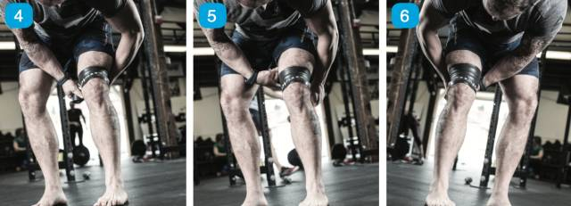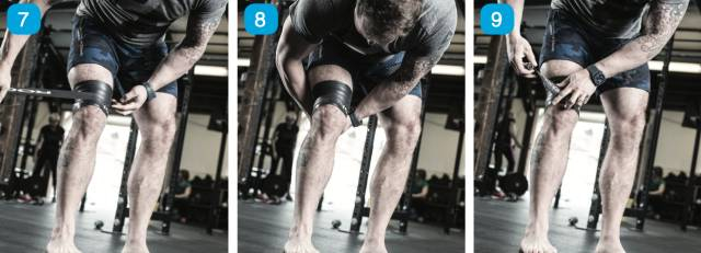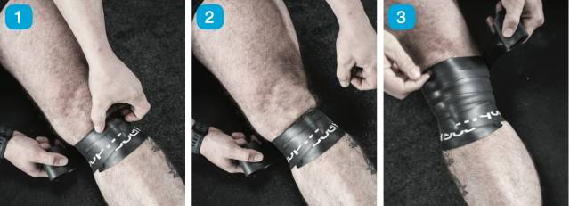 这一组图片将说明如何使用缠绕带压缩方法处置跑步膝(膝盖肿胀,髌骨下方疼痛)。