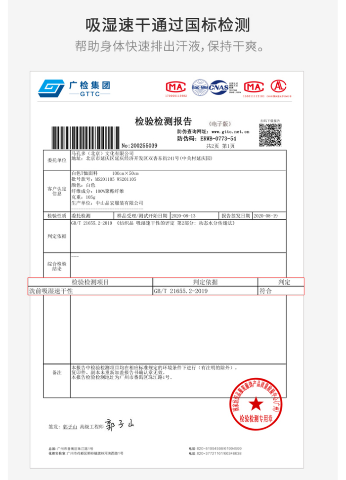 2. 吸湿速干,通过国标检测