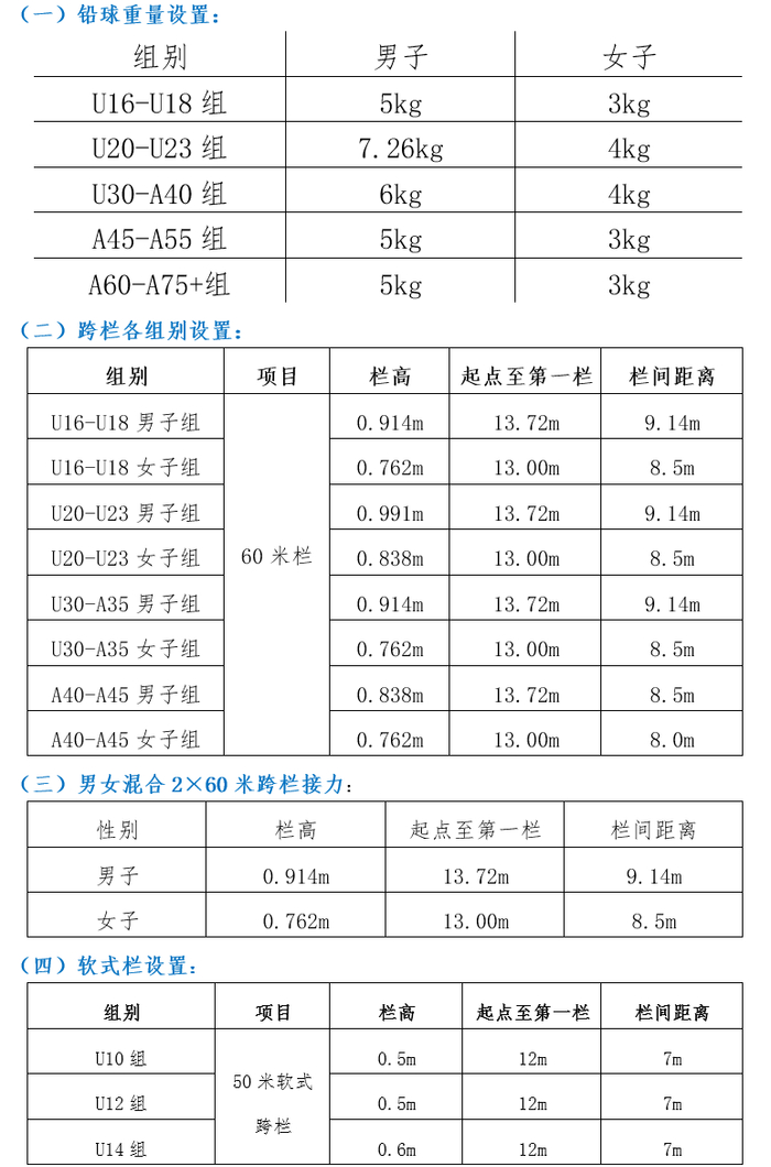 接力项目:男女混合2×60米栏接力(1男1女,第一棒女子)、男女混合4×200米接力(1女3男,第一棒女子)