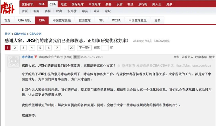 面对近期部分球迷所热议的有关咪咕在CBA转播过程中所存在的一些问题,咪咕方面也给予了高度关注。本着主动寻求改进和解决问题的出发点,咪咕近日在虎扑CBA论坛专区发布了征集球迷意见帖,同时还为球迷提供了观赛说明书。
