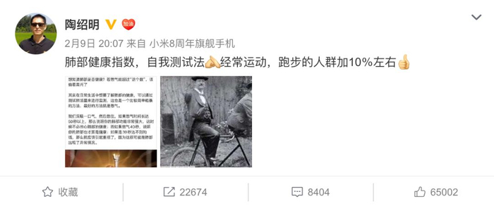 其实自测心肺有很多方法,2020年2月时,前国家女子长跑马拉松队教练、火车头体协马拉松队教练陶绍明发布一条微博,向大家介绍肺部健康自我测试简易方法,经常运动、跑步的人群的肺活量普遍高10%,真的是这样吗?广大跑友们可以自测一下:
