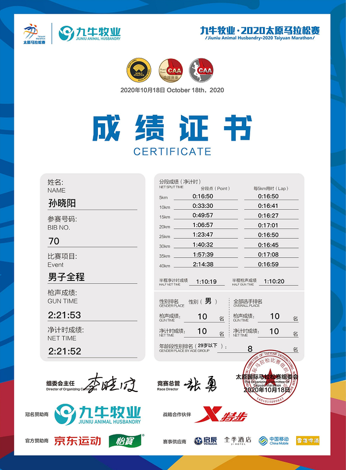 2019年北马他跑出了2:41:05的佳绩,而一年后,上周太原马拉松他把自己的全马最好成绩提高到了2:21:52,一跃成为河北业余一哥!