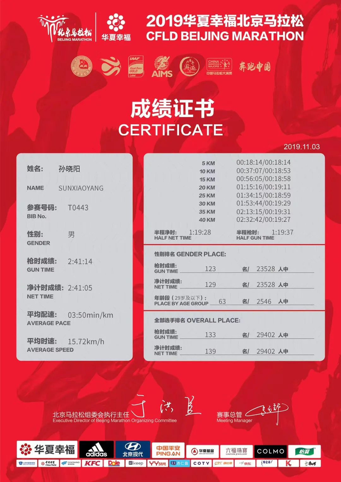 此后他又先后跑了9月北京马拉松(2:58),10月唐山马拉松(2:58:24),12月广州马拉松(2:56:47)。