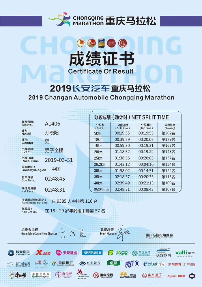 2019年春,重庆马拉松,他开启“复仇之战”,2小时48分,PB了8分钟。