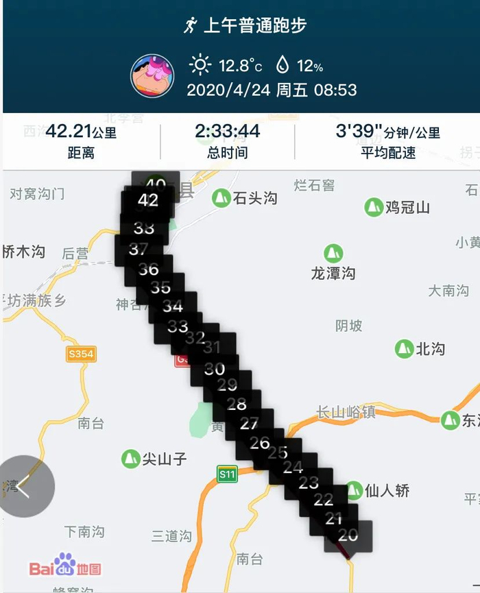 4月24日,他自己尝试跑了一个全马,用时2小时33分,几个月的默默付出,有了收获,也坚定了他继续跑下去的信心。