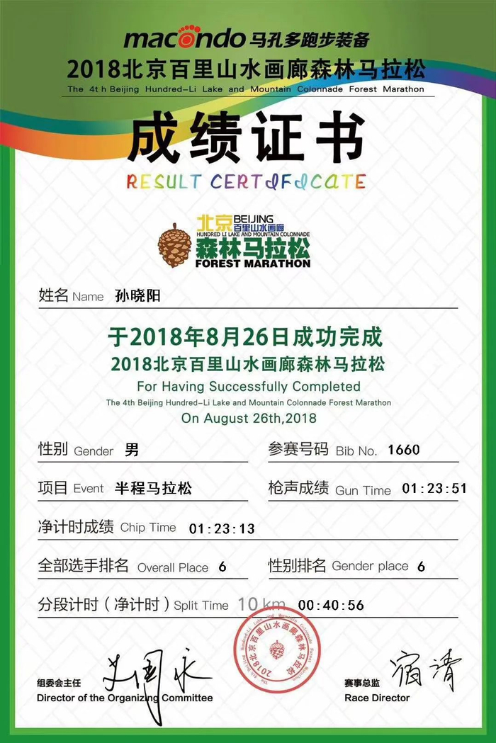 经过四个月的休整,他感觉自己伤势好了不少,2018年8月北京百里山水画廊半马,他以1:23:13的成绩,获得第6名。