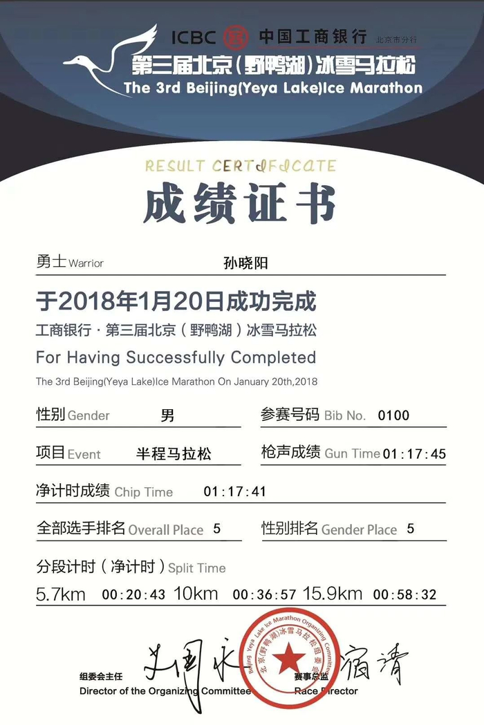 2018年初,他和一些跑友报了第三届北京野鸭湖冰雪马拉松,首场半马比赛,他就跑了1:17:41,第5名。让跑团的朋友们惊呼天赋异禀。