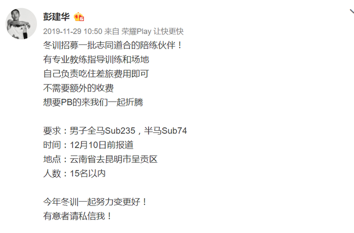 2019年冬天,孙晓阳偶然在微博中看到知名马拉松运动员彭建华发布了一条面向社会招募冬训陪练员的消息。要求是有田协认证全马2小时35以内,半马1小时14分以内成绩。
