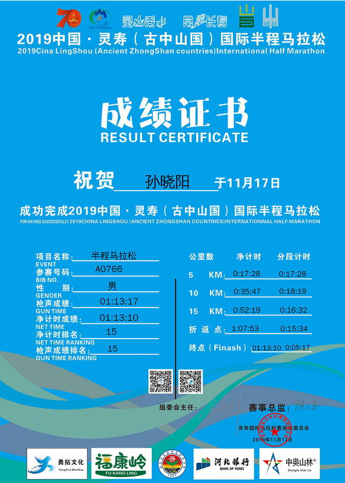 两周后,灵寿山半马,他将成绩提升到了1:13。