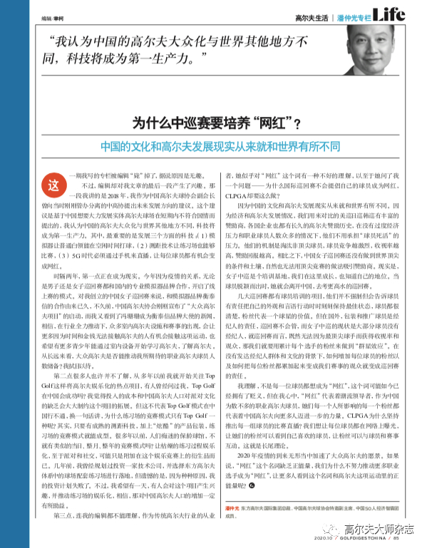 2020年疫情的到来无形当中加速了大众高尔夫的愿景。如果说,“网红”这个名词缺乏正能量,我们为什么不努力推动更多职业选手成为“网红”,让更多人看到这个名词和高尔夫这项运动里的正能量呢?