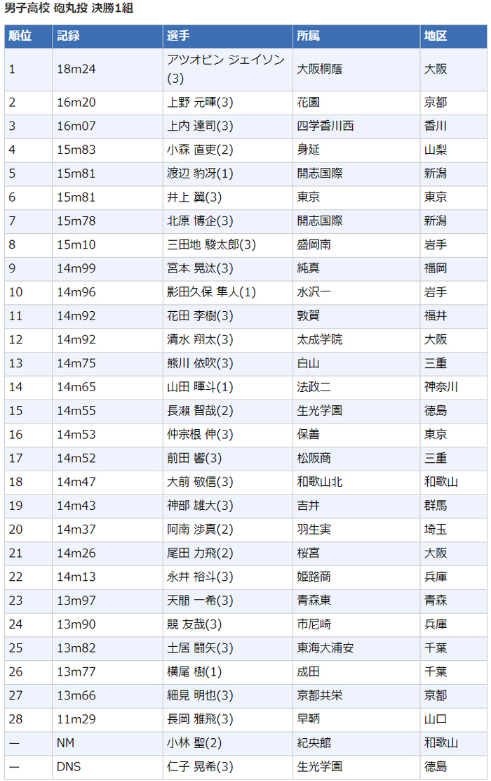 高中男子铅球(6公斤)