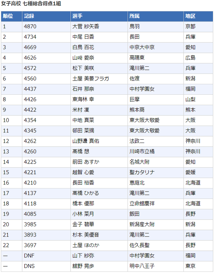 这是全能冠军大菅纱矢香的七个单项的成绩——100米栏14.78秒,跳高1.56米,铅球9.45米,200米26.98秒,跳远5.41米,标枪41.02米,800米2:26.18。