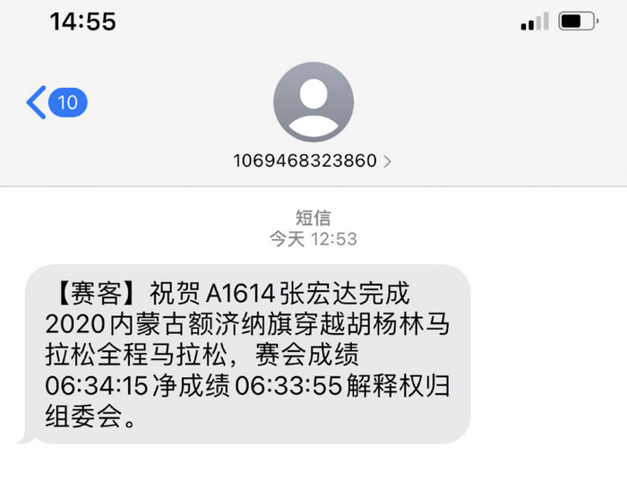 距离2020内蒙古额济纳旗穿越胡杨林马拉松已经过去十多天,昨天多位弃赛选手却收到了完赛短信,成绩也精确到了时分秒,令当事者大吃一惊,这到底是怎么回事?