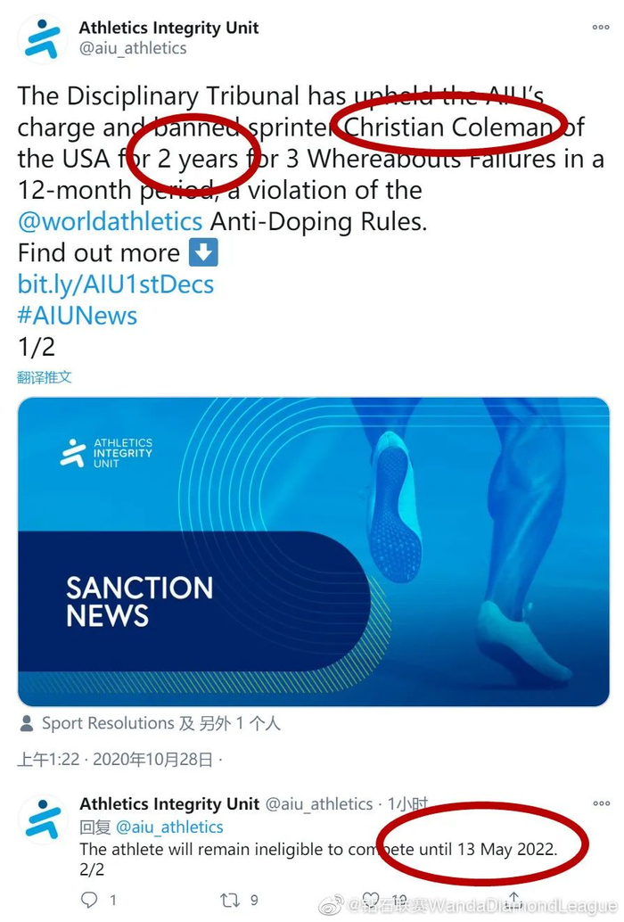 10月28日,世界田联旗下田径诚信组织公布重磅罚单,2019年多哈世锦赛男子100米冠军、美国短跑新领袖克里斯蒂安-科尔曼被处以禁赛两年的处罚。