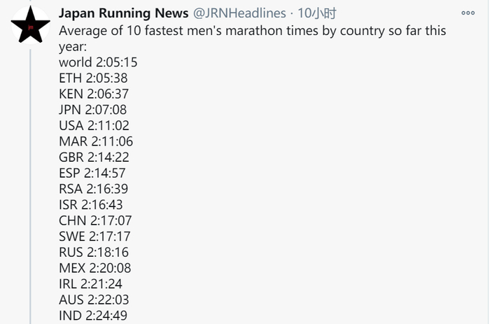 10月27日,日本媒体Japan Running News盘点了世界马拉松综合成绩榜单,并给出了各国男女子成绩排名。此次排名按照每个国家马拉松前10名成绩的平均成绩为标准。