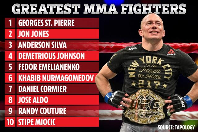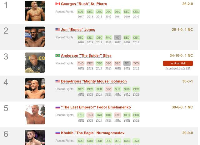 圣皮埃尔高居榜首。这位传奇的加拿大拳王于2013年从次中量级冠军的位置上退休,2017年又王者回归,并且希望2021年和小鹰打一场(现在看来是不可能了)。GSP职业生涯获得26胜,仅2负,入选UFC名人堂。较之存在药检污点的骨头和蜘蛛,GSP没有什么可指摘的,他13次获得UFC世界冠军,也是相当了不起的数据。