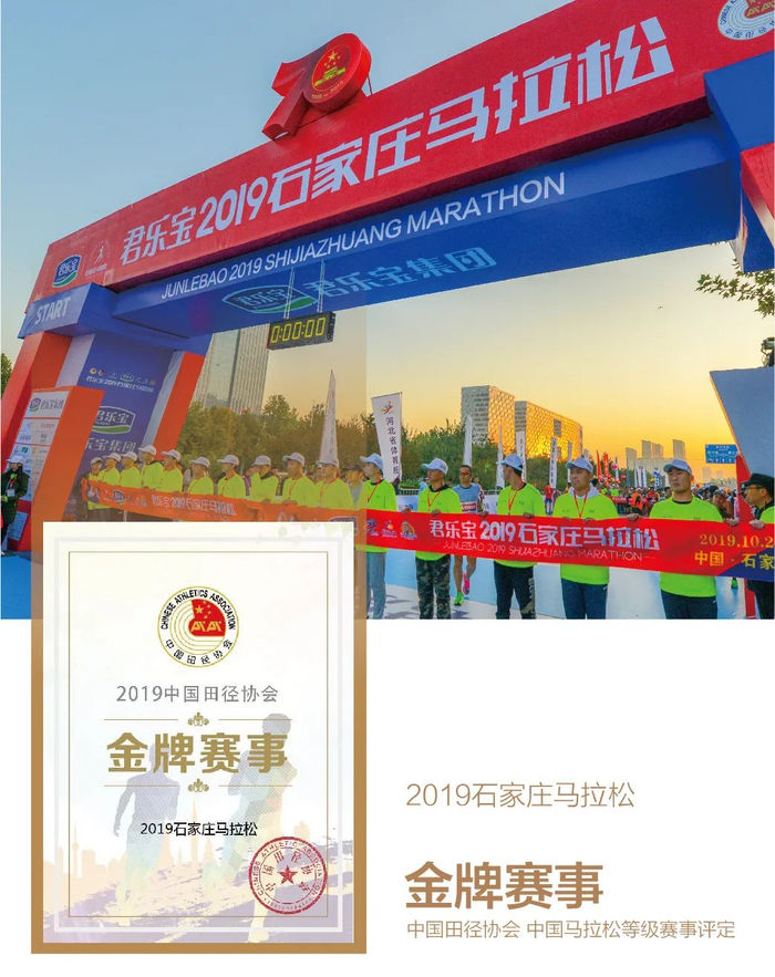 10月9日,中国田径协会正式公布2019中国马拉松等级赛事及特色赛事评定结果,石家庄马拉松荣获“金牌赛事”。石家庄马拉松也是石家庄市体育局“全城热练”品牌十大推荐赛事之首,“全城热练”是石家庄市体育局着力打造的体育赛事活动推广平台和全民健身品牌,旨在汇聚政府、社会和市场各方的力量,“三轮驱动”,合力打造出更多适合不同群体、群众喜闻乐见的体育赛事。石家庄马拉松从2016年开始赛事等级逐年提升,稳扎稳打,致力于为每位跑者打造一场高水准、高质量的的马拉松。