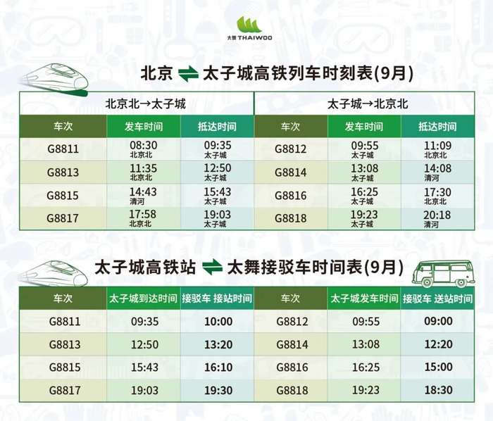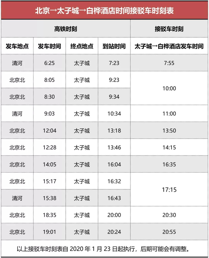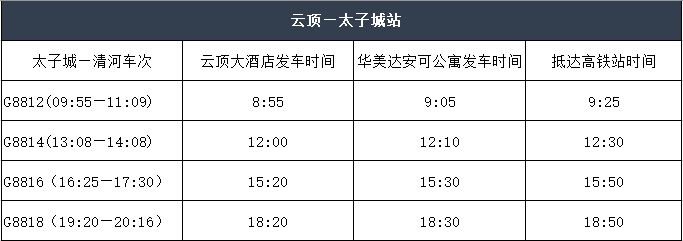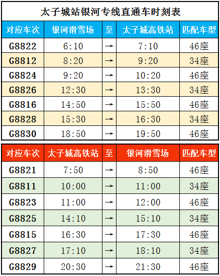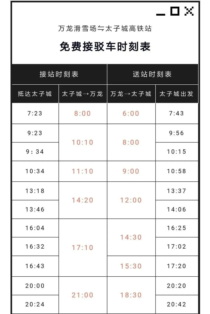 怎么去雪场?从太子城高铁站去往各个雪场,全部都有雪场巴士!下表仅供参考,下高铁前记得要提前在各个雪场公众号查询最新的雪场接驳车时刻表。