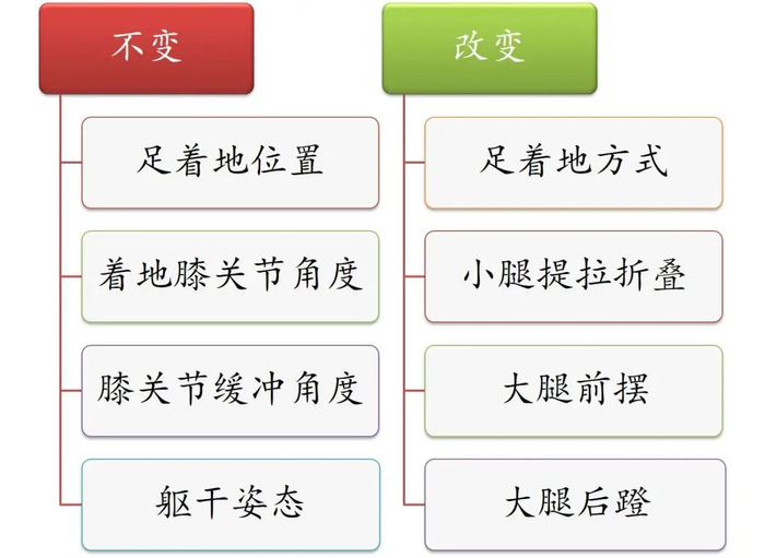 前文中提到速度由慢到快时,除了躯干姿态没有变化,还有一个重要特征没有变化,那就是着地位置和姿态,着地时保持膝关节弯曲和积极下压是实现轻盈跑姿的关键。