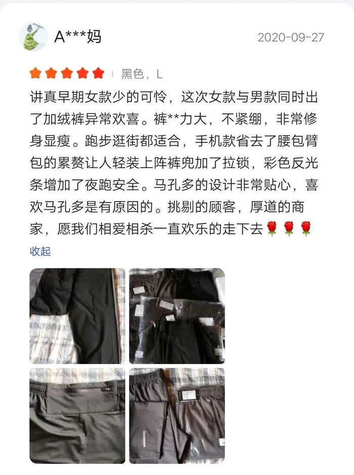 马孔多能装手机加绒跑步长裤,9月底,在马孔多京东和天猫旗舰店默默上架之后,不少跑友用下单表达对马孔多品牌的厚爱与支持,也得到了不少跑友试穿后的实际感受,且看——