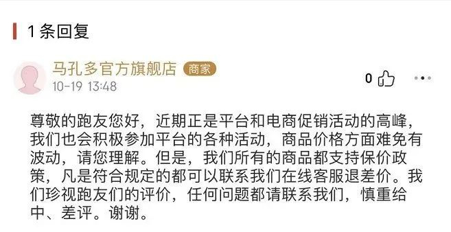 大掌柜的同事及时给予了差价补偿,其目的,不是为了化解这一个差评,而是我们发自内心地希望,所有跑友在马孔多购物都是没有后顾之忧的: